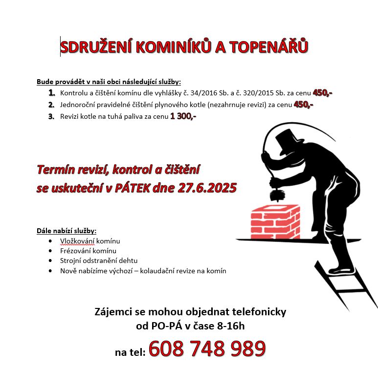 Sdružení kominíků a topenářů plánuje provádět v naší obci řadu důležitých služeb, včetně kontroly a čištění komínů dle platné vyhlášky. Náklady na tyto služby jsou stanoveny na 450,- Kč za kontrolu a čištění komínu a 1 300,- Kč za revizi kotle na tuhá paliva. Termín provádění se uskuteční v pátek 27. června 2025, a zájemci se mohou objednat telefonicky v pracovních dnech od 8 do 16 hodin.