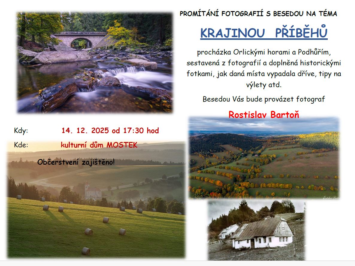 Zveme vás na zajímavé promítání fotografií s besedou na téma "Krajina příběhů", které vás provede krásnou přírodou Orlických hor a Podhůří. Fotograf Rostislav Bartoň představí jak současné snímky, tak i historické fotografie těchto míst. Akce se uskuteční 14. prosince 2025 od 17:30 hodin v kulturním domě v Mostku. Občerstvení bude zajištěno. Těšíme se na vaši účast.